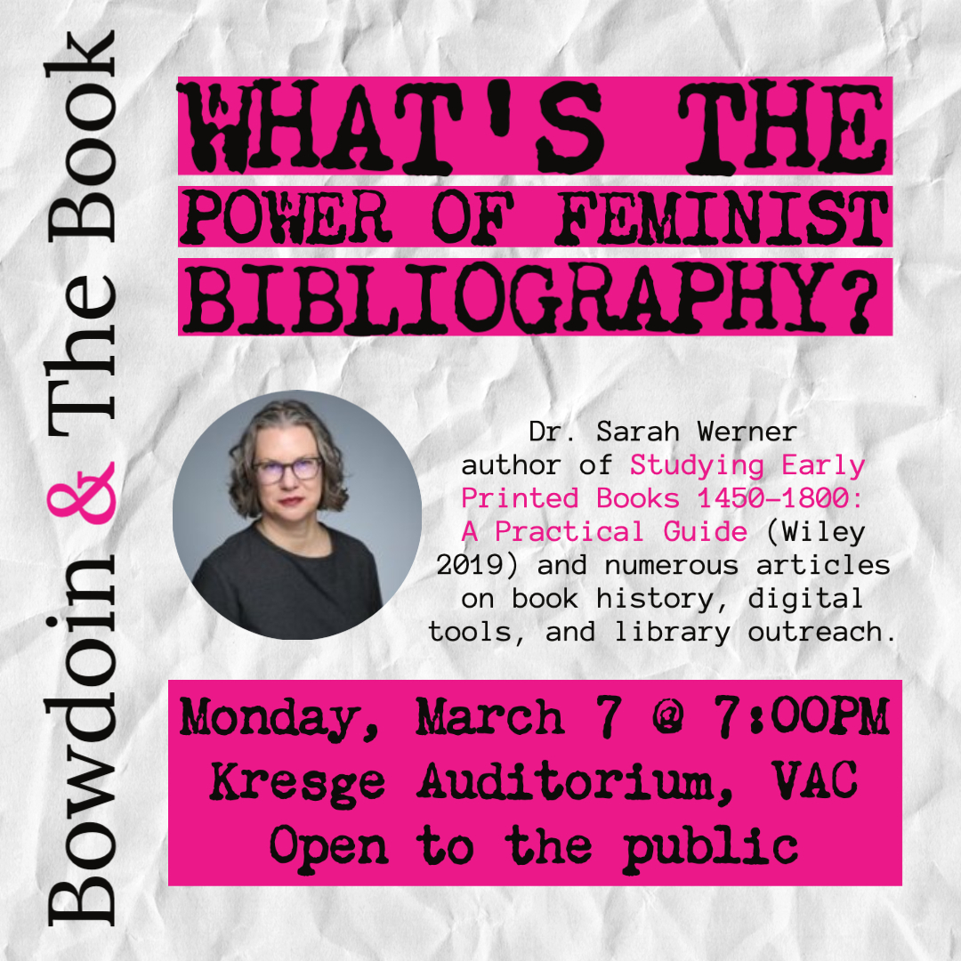 Bowdoin & The Book seeks to elevate conversations about the “book,” broadly defined to extend from oral traditions to manuscripts, printed books, and digital media, to serve as the conduit for an exploration of the intersections of history, technology, culture, language, literature, economics, art, representation, and more. By positioning Bowdoin College Library’s George J. Mitchell Department of Special Collections & Archives as a site of encounter and to situate collections-based study and research within the rich landscape of Maine-based book artists, craftspeople, and booksellers–we hope this series and related efforts will provide research and pedagogical support to effectively engage in high-impact learning across disciplines and co-curricular programs, promote discursive and creative thinking, confront a diversity of perspectives, and acquire hands-on and field work experience.